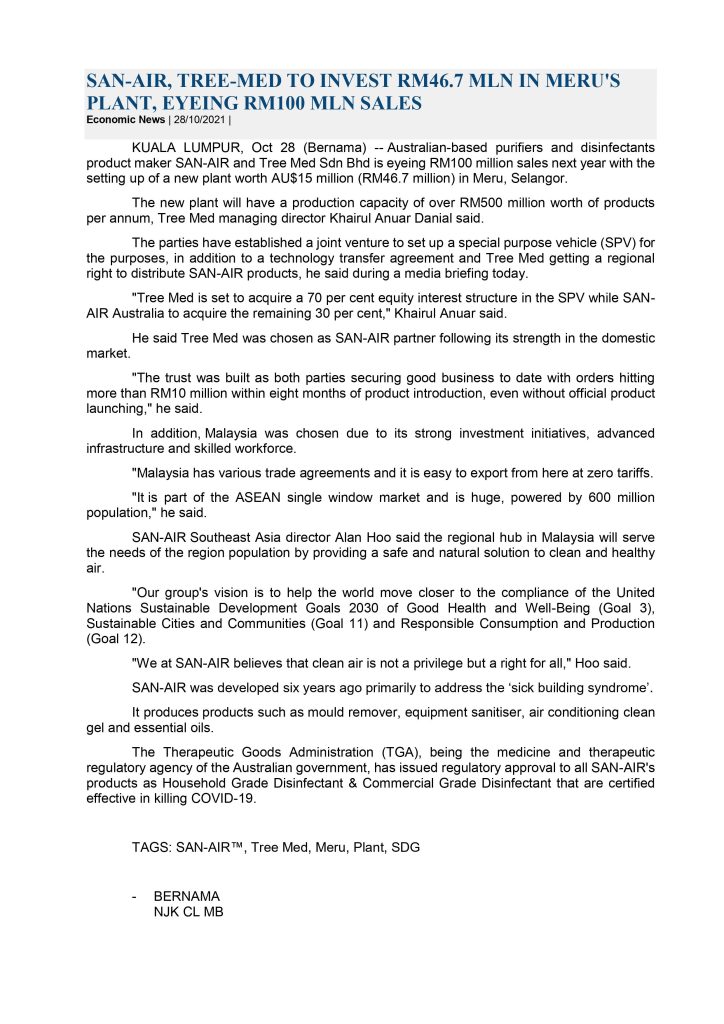 - SAN-AIR, TREE-MED TO INVEST RM46.7 MLN IN MERU’S PLANT, EYEING RM100 MLN SALES